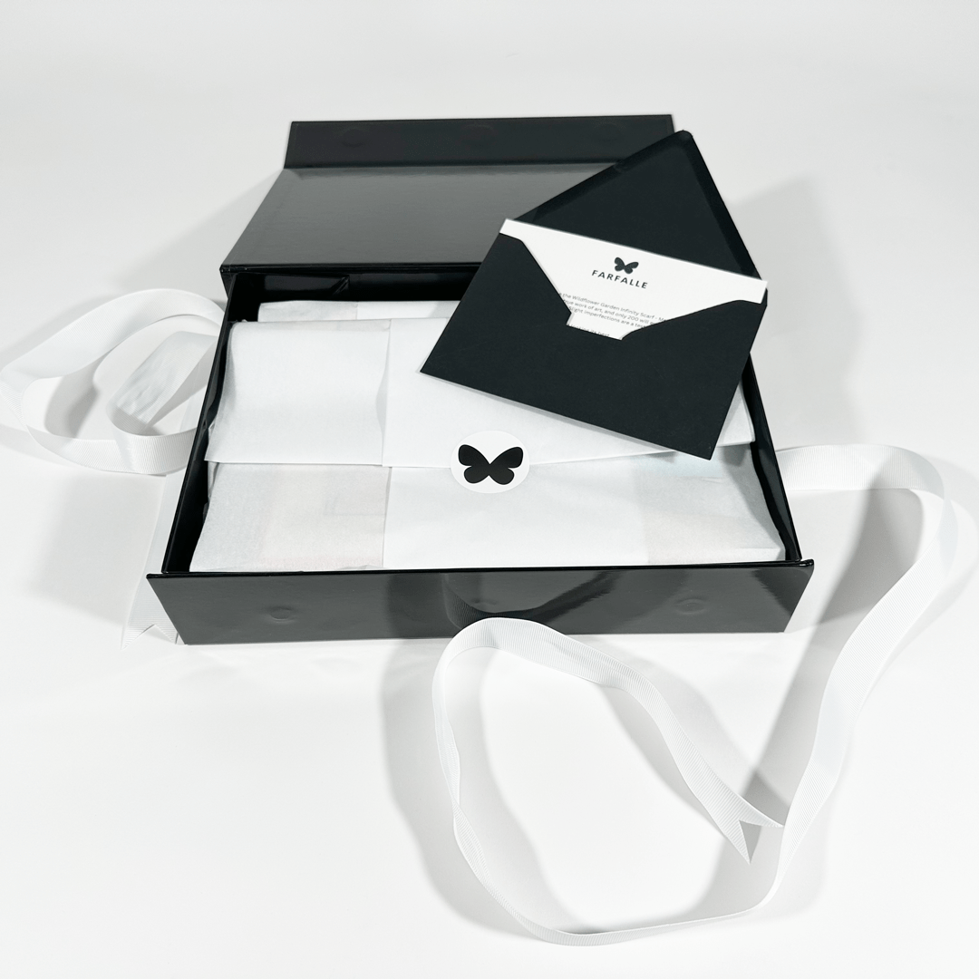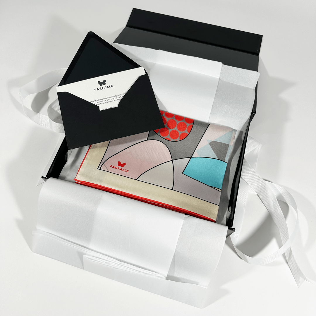 Every Farfalle creation arrives in a sleek, polished black magnetic box, designed to be both functional and beautiful. Wrapped with a crisp white grosgrain ribbon, the packaging exudes timeless sophistication. Perfect for gifting or storing your scarf, it reflects the luxury and care that define Farfalle.